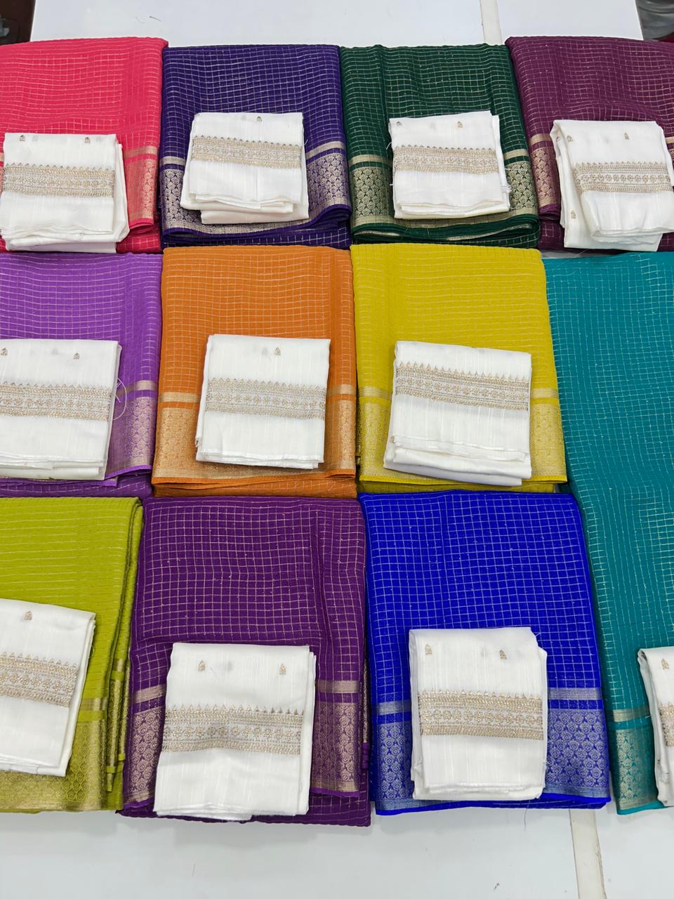 Product Description: Chinnon Self Chex Saree Anmol Border Chex Running Blouse With Border + Additional White Blouse