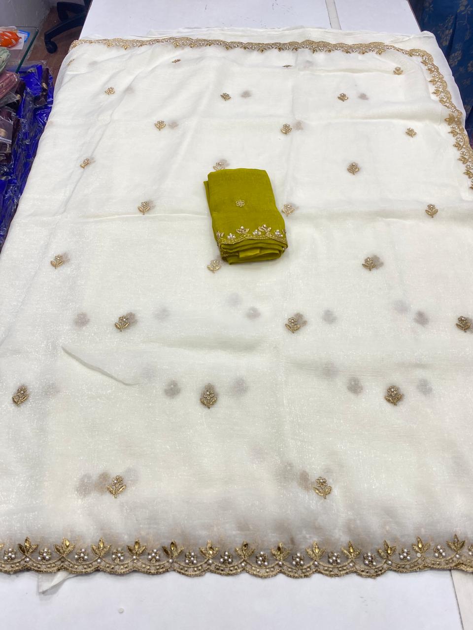 Product Description: Fancy Space Silk Off White Saree Contrast Blouse