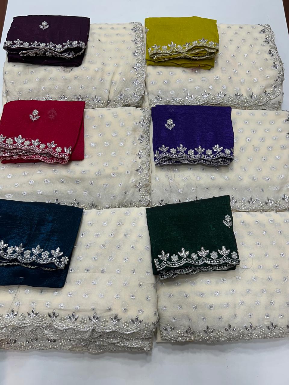 Product Description: Fancy Space Silk White Saree Stone Work Border Contrast Blouse