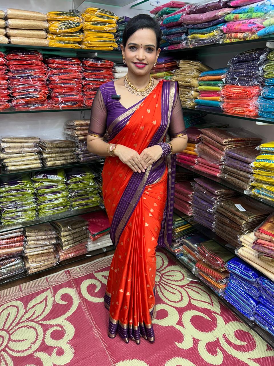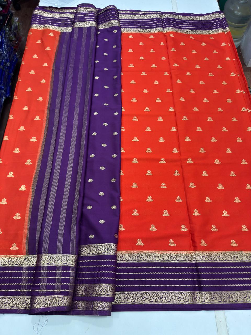 Product Description: Mysore Crepe 2D Butta Orange Saree Contrast Purple Border Contrast Butta Blouse With Border