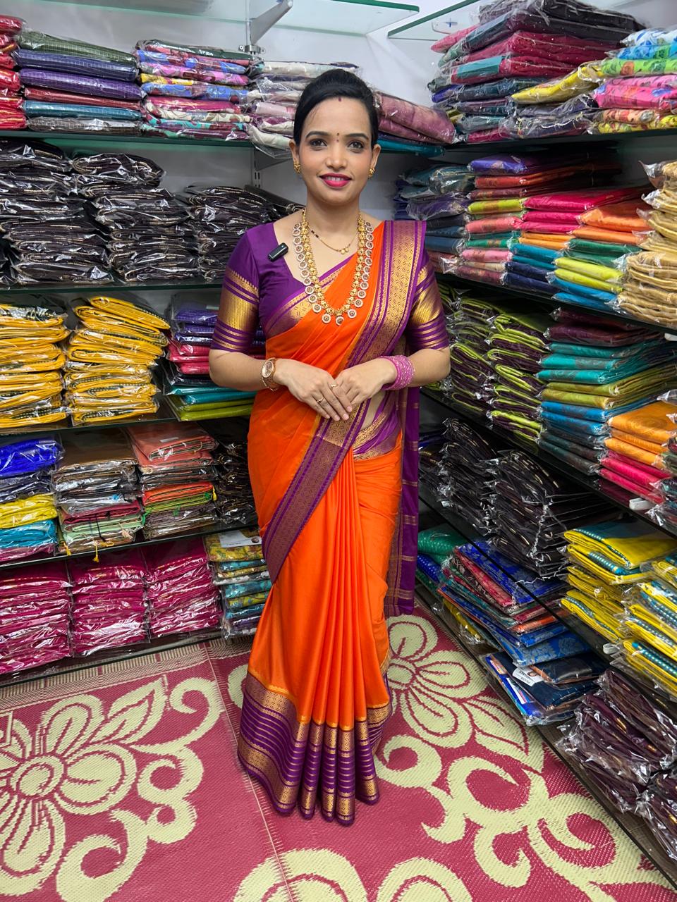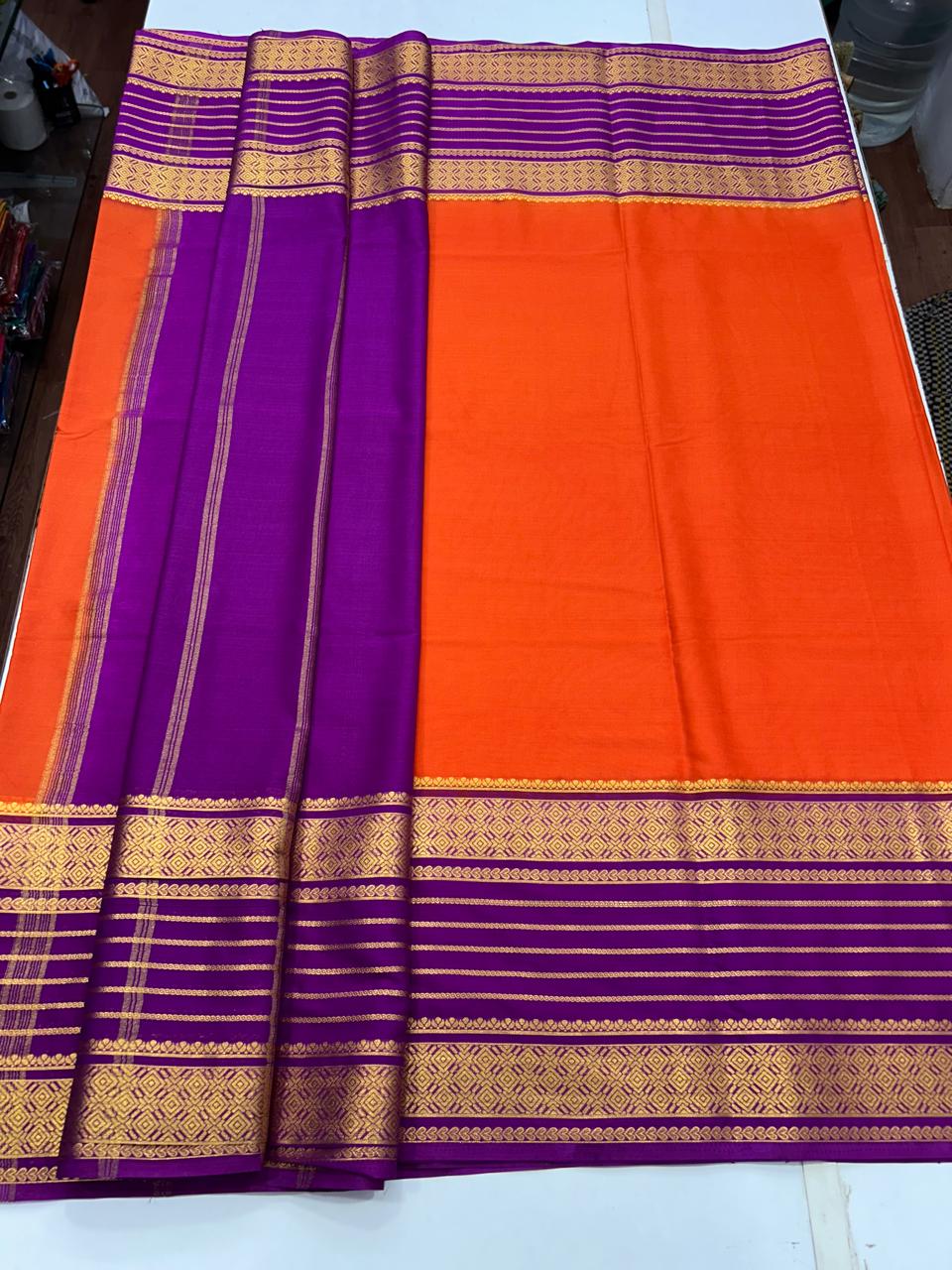 Product Description: Mysore Crepe 2D Orange Saree Contrast Magentha Border Contrast Blouse With Border