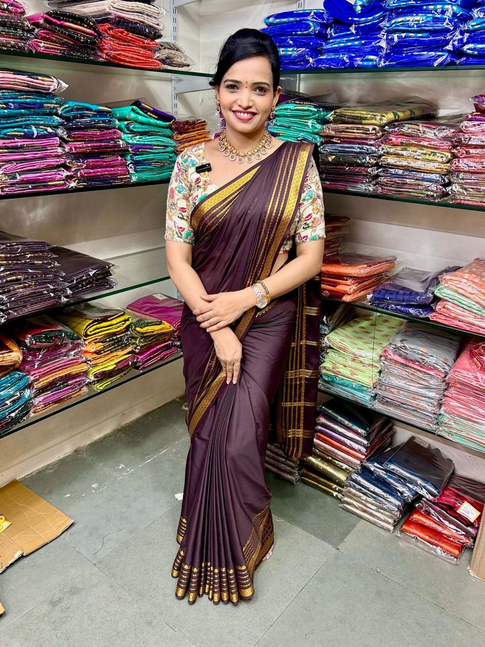 Product Description: Mysore Crepe Chocolate Saree Plain Running Blouse With Border