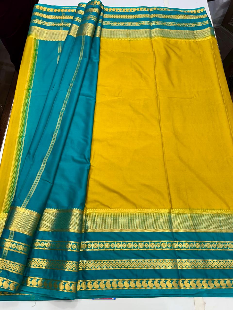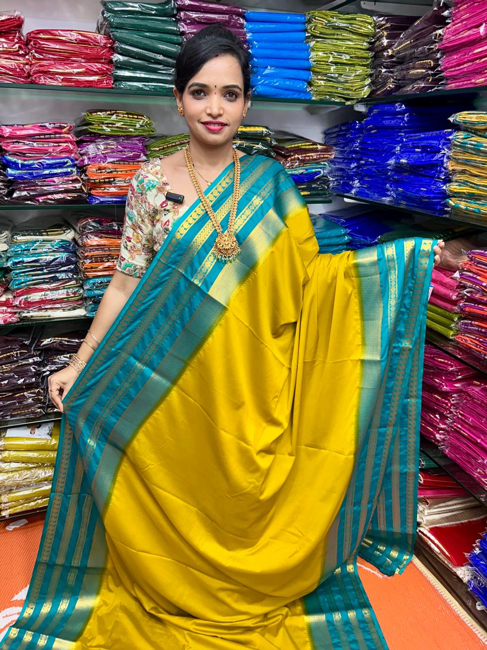Product Description: Mysore Crepe Dani Saree Anmol Jari Big Safair Bentex Border Contrast Blouse With Border