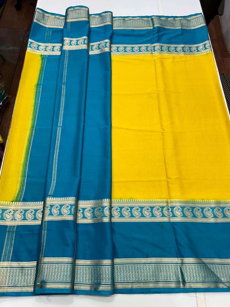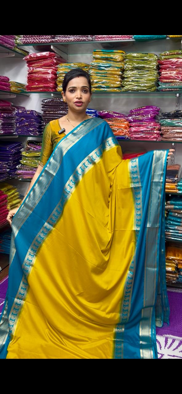 Product Description: Mysore Crepe Dani Saree Anmol Jari Big Safair Bentex Border Contrast Blouse With Border