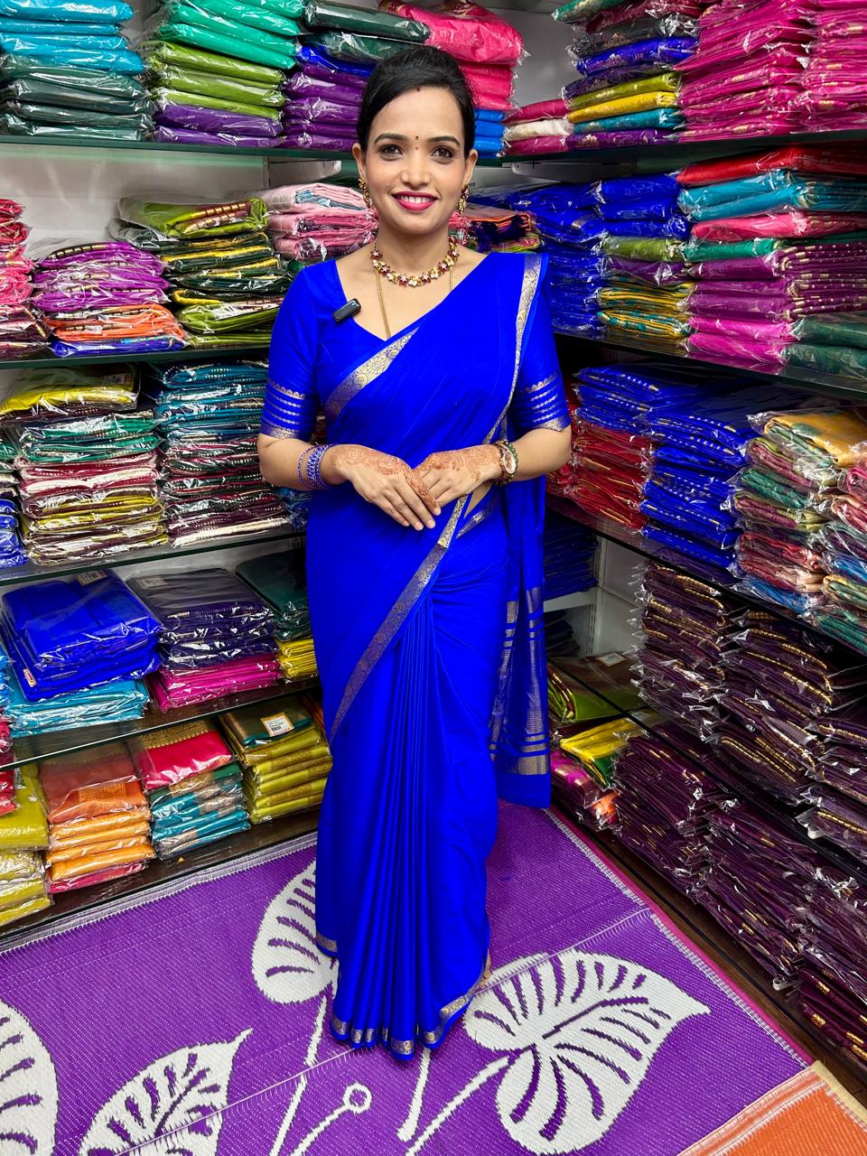 Product Description: Mysore Crepe Royal Blue Saree Plain Running Blouse With Border