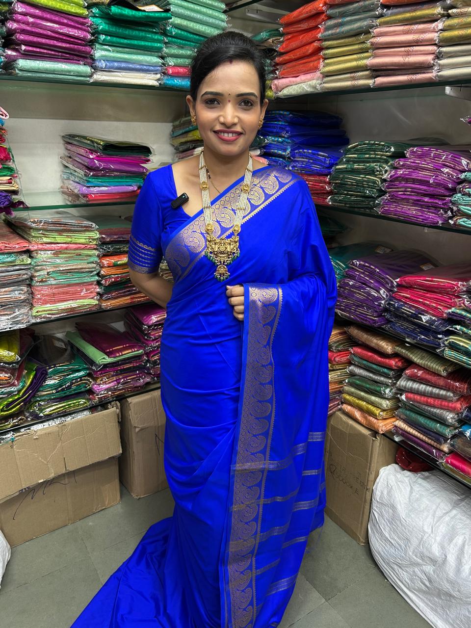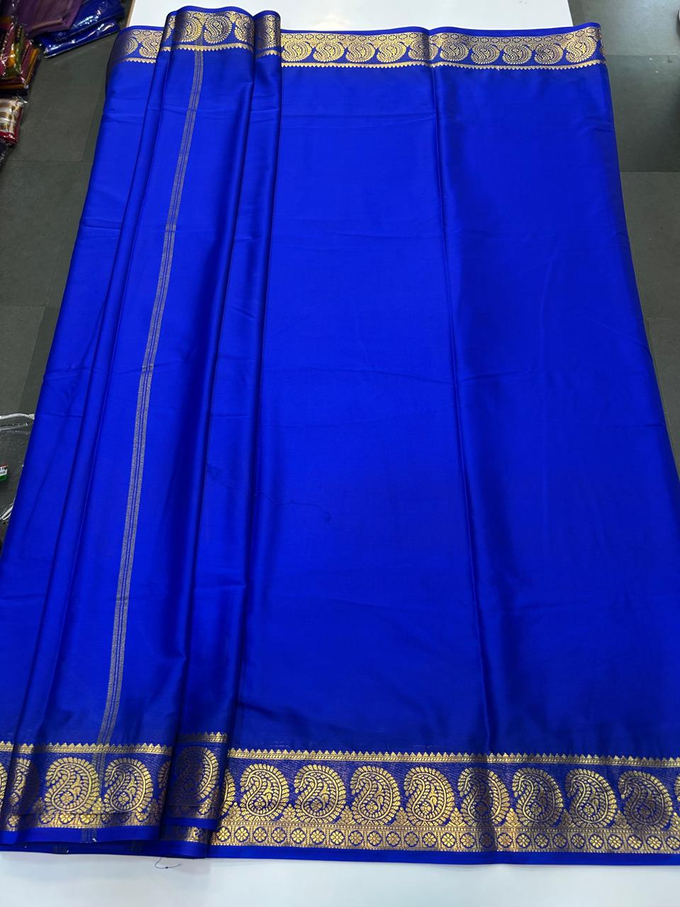 Product Description: Mysore Crepe Royal Blue Saree Plain Running Blouse With Border