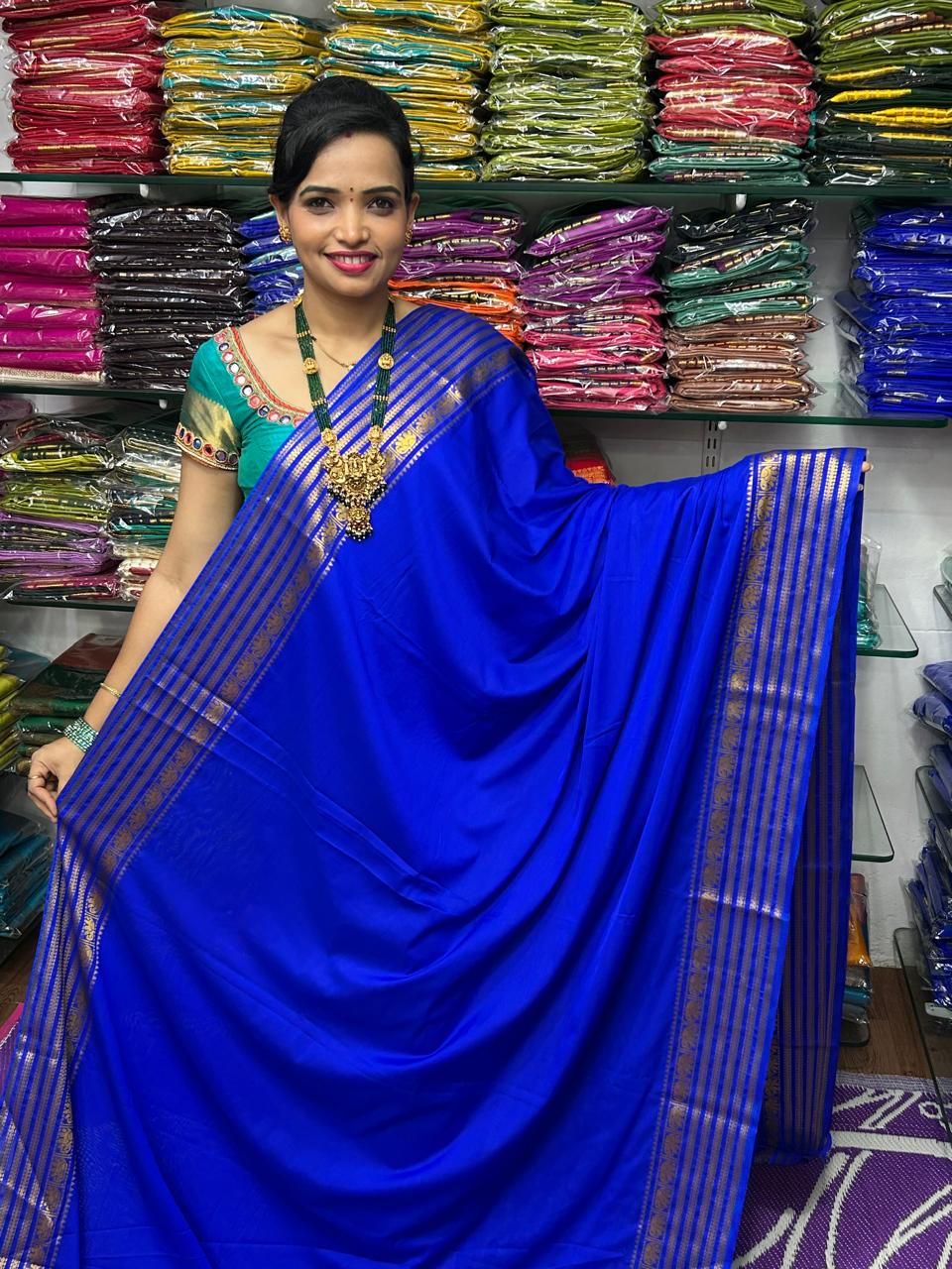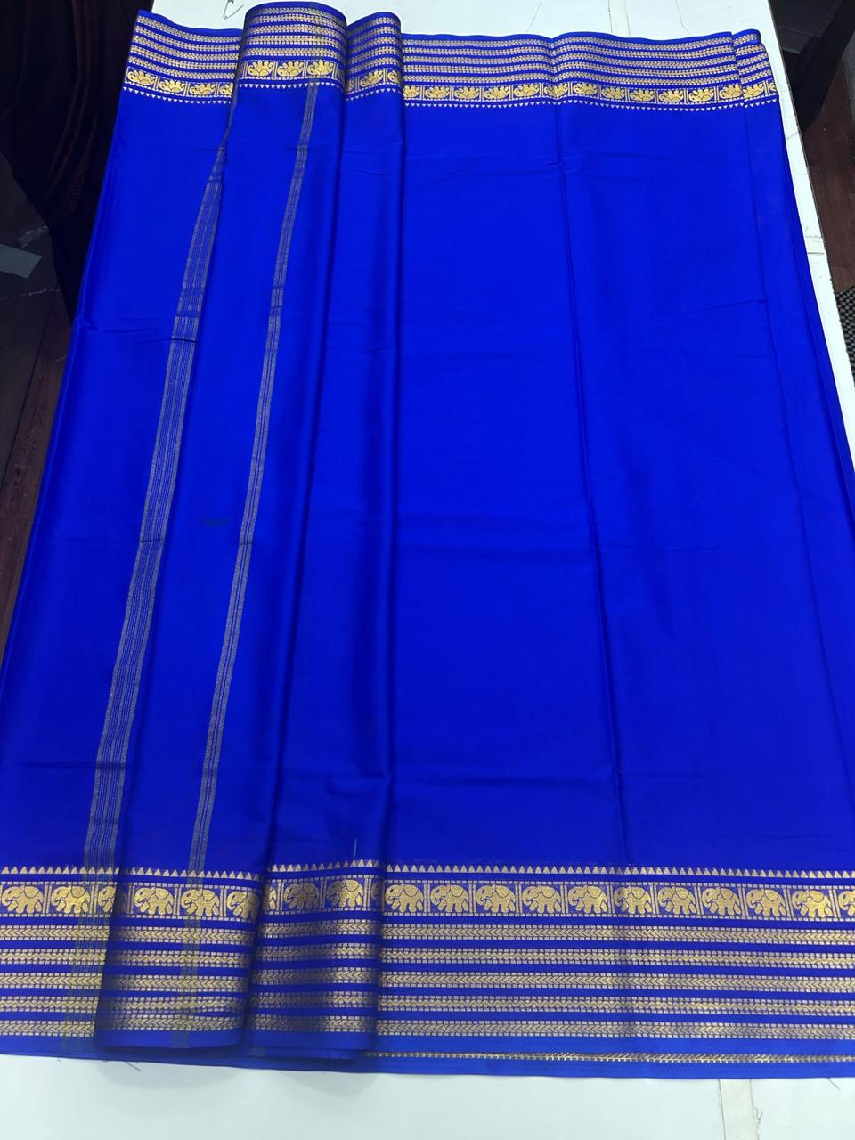 Product Description: Mysore Crepe Royal Blue Saree Plain Running Blouse With Border