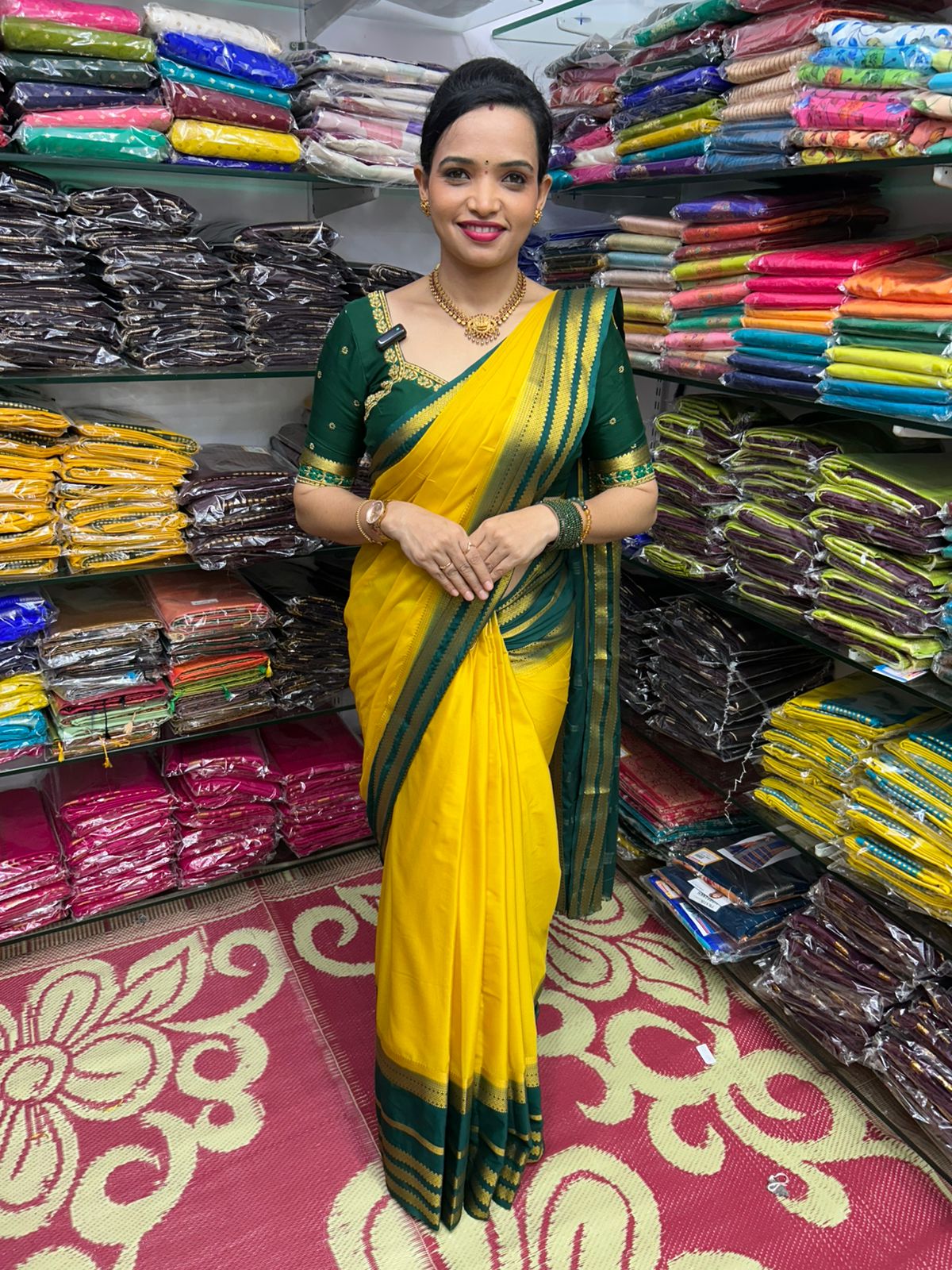 Product Description: Mysore Crepe Saree Big Bentex Border Contrast Running Blouse With Border